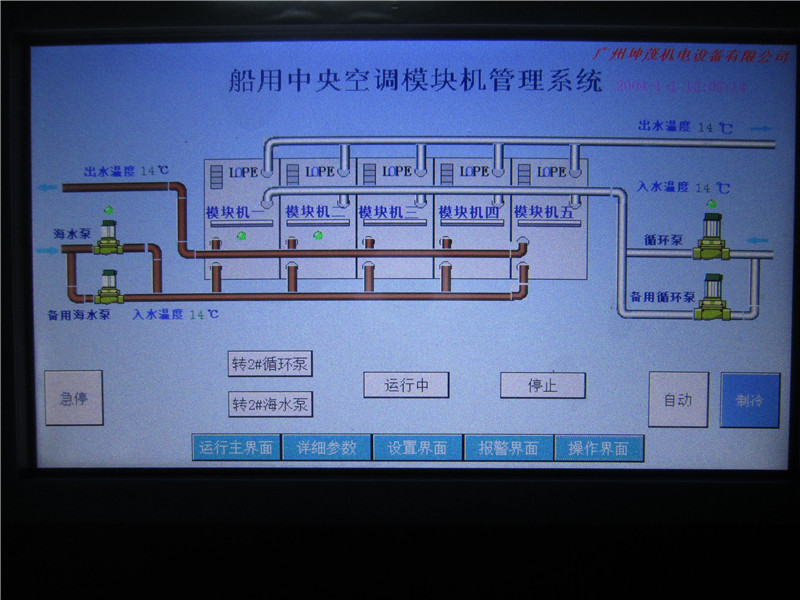 停止----手动状态下,需逐个按每一个对应设备的按键停止;自动状态下,按“停止键”所有模块机立即停止,循环泵运行60S后停止。