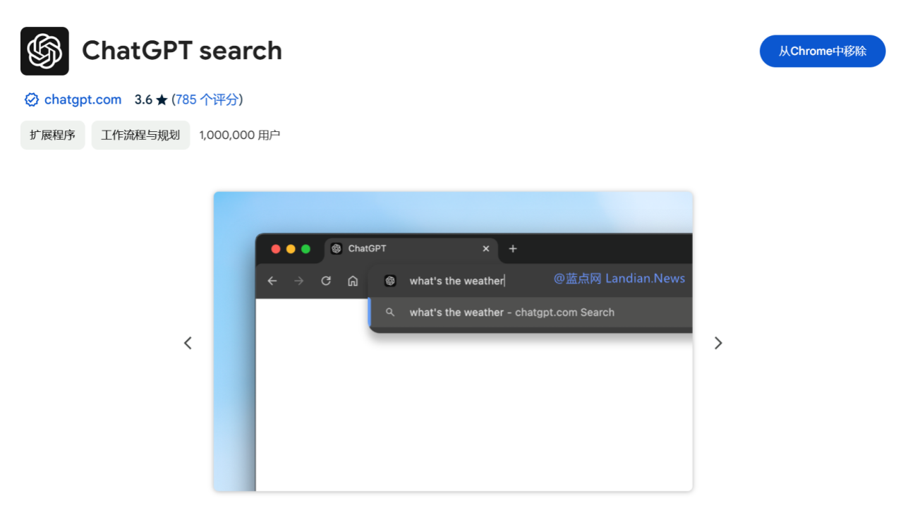 安装后这个扩展程序会自动将 Chrome 或 Microsoft Edge 的默认搜索引擎换成 ChatGPT Search,如果你不想使用了那也可以直接删除这个扩展程序。