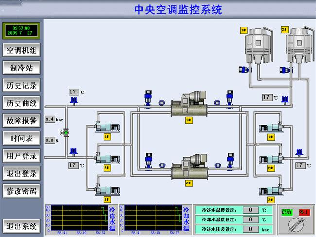 电脑终端上位机软件可以使用C#语言/ifix6.0/Intouch/WinCC/组态王/MCGS等第三方软件。通过E-link 网关卡_BAnet或ModbusRTU通讯协议与约克空调机组网络信息同步。常用上位机软件监控界面有:登录界面、运行界面、数据表、曲线图、报警界面等。