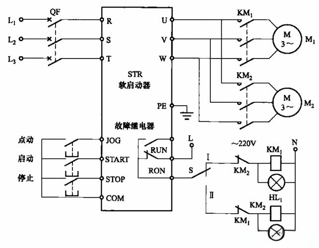 控制端子用于连接控制电路,信号灯则用于显示软启动过程中的运行状态。接线图中,信号灯通常与软启动器的控制端相连,用于指示设备的启动、运行和故障状态。